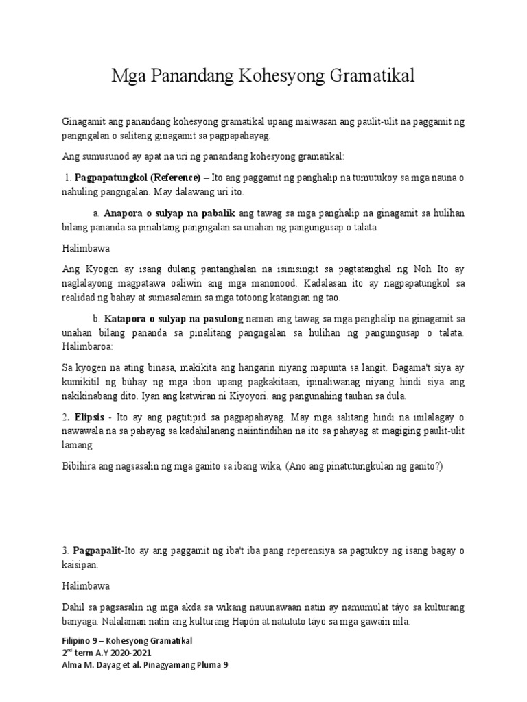 Apat na uri ng mga panandang kohesyong gramatikal. Learn vocabulary terms and more with flashcards games and other study tools. May tatlong uri ang Ayon sa Kailanan.