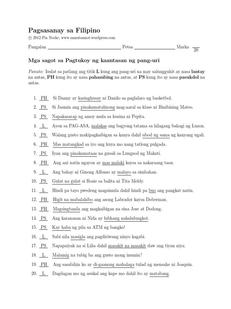 Mga Sagot Sa Pagtukoy Ng Kaantasan Ng Pang Uri 1 Pdf