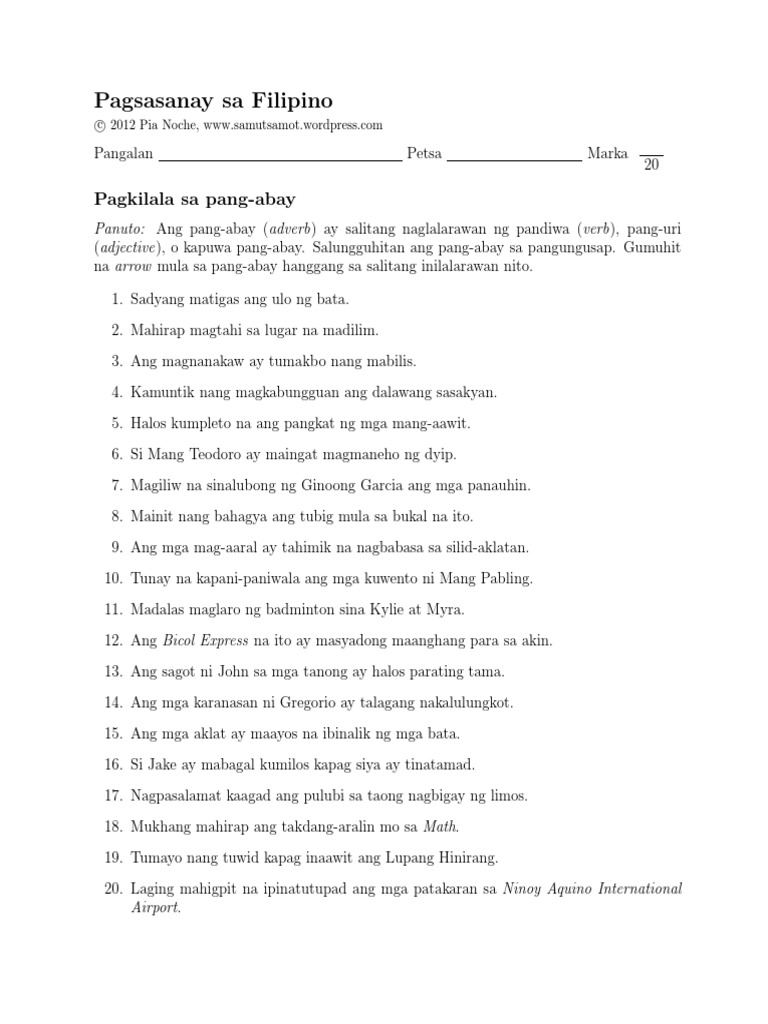 Samut-samot pang-abay worksheets. Nov 28 2012 You may print and distribute these worksheets to your children or students but please do not do so for profit. Feb 01 2013 Pagtukoy ng Uri ng Pang-abay_2. The sentences refer to jose rizal the national hero of the philippines.