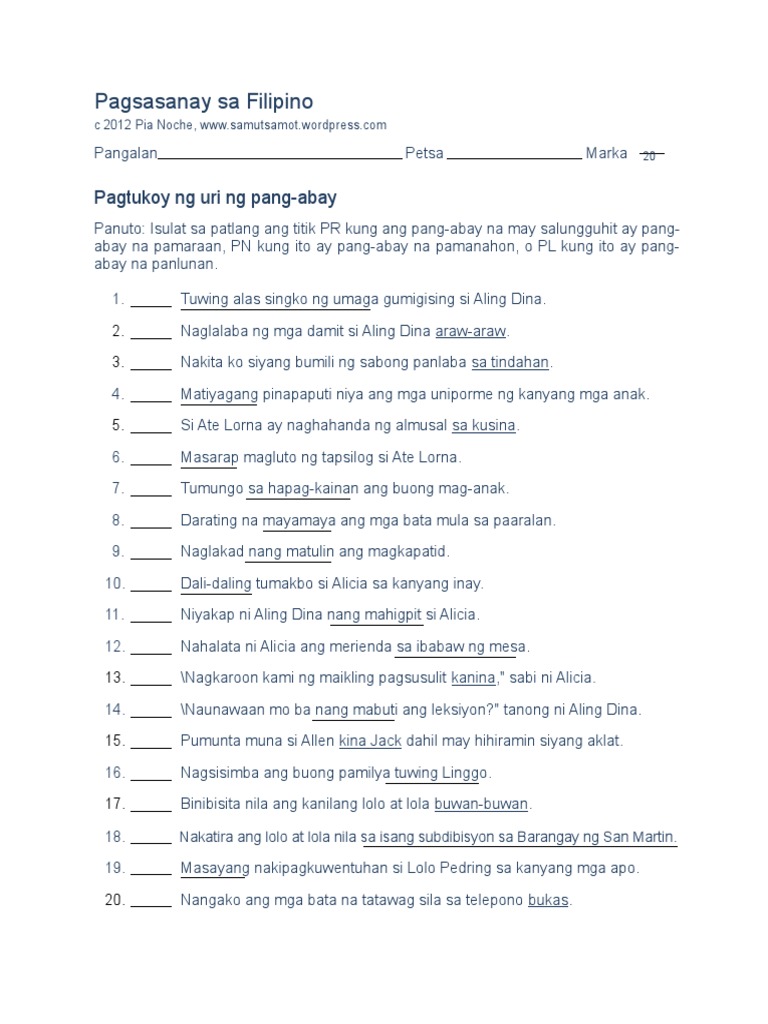 FILIPINO PANG URI AT PANG. Displaying all worksheets related to - Mga Uri Ng Pang Abay. Pangungusap Worksheets Part 2 â Samut samot.